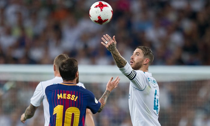 Sergio Ramos refuses to play ball with Lionel Messi. Photograph: Denis Doyle/Getty Images